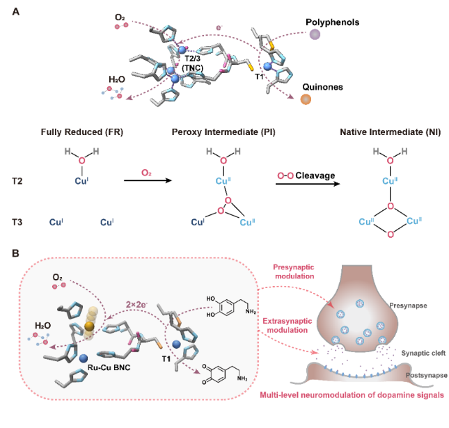 近期,课题组基于细菌漆酶(SLAC)骨架,设计了一种具备高柔性异核金属催化中心的人工金属酶(RuCu-SLAC)。利用蛋白质亚基界面Ru、Cu位点的动态偶合,构建了自适应催化反应路径,以抵抗OH-对于酶催化活性的抑制,实现了在生理pH下高效催化四电子氧气还原偶合的多巴胺氧化反应,突破了天然漆酶在生理环境下活性低的局限。在细胞层次,RuCu-SLAC经脂质体递送,可有效调控胞内多巴胺的合成和转运,降低了多巴胺囊泡内容物的含量和释放水平。在活体层次,RuCu-SLAC的原位注射有效降低了鼠脑中多巴胺的刺激释放。该进展提出了利用人工金属蛋白酶实现神经调控的新策略,有望用于生理病理过程脑内多巴胺存在水平的有效调控。